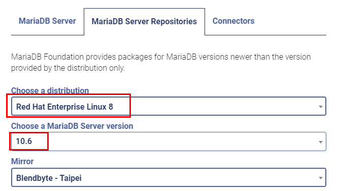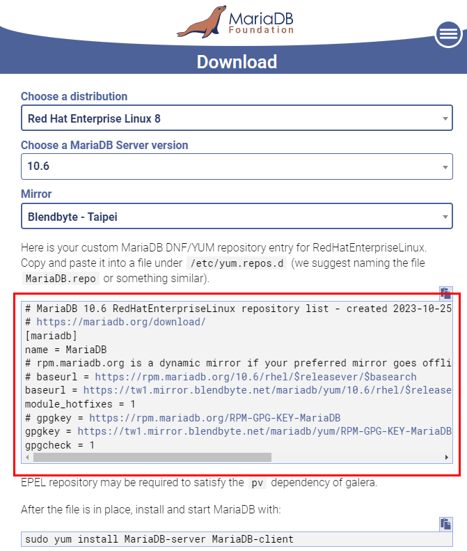 baseurl = https://tw1.mirror.blendbyte.net/mariadb/yum/10.6/rhel/$releasever/$basearch